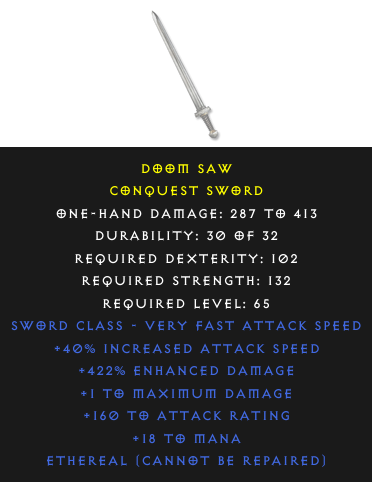 Required Level: 65+40% Increased Attack Speed+1 to Maximum Damage+160 to Attack Rating+422% Enhanced Damage+18 to Mana