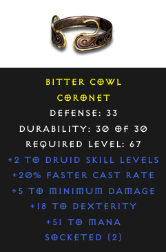 Required Level: 67+2 to Druid Skill LevelsDefense: 33+20% Faster Cast Rate+18 to DexteritySocketed (2)+5 to Minimum Damage+51 to Mana