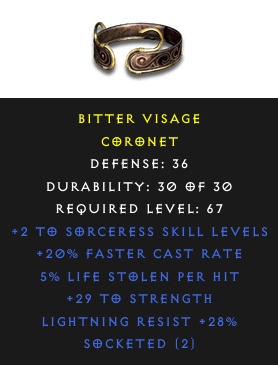Required Level: 67+2 to Sorceress Skill LevelsDefense: 36+20% Faster Cast Rate+29 to StrengthSocketed (2)Lightning Resist +28%5% Life stolen per hit