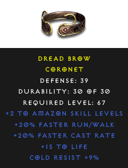 Required Level: 67+2 to Amazon Skill LevelsDefense: 39+20% Faster Cast Rate+20% Faster Run/Walk+15 to LifeCold Resist +9%