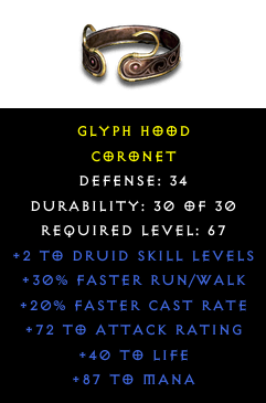 Required Level: 67+2 to Druid Skill LevelsDefense: 34+20% Faster Cast Rate+30% Faster Run/Walk+72 to Attack Rating+40 to Life+87 to Mana