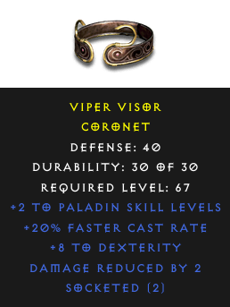 Required Level: 67+2 to Paladin Skill LevelsDefense: 40+20% Faster Cast Rate+8 to DexteritySocketed (2)Damage Reduced by 2