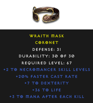 Required Level: 67+2 to Necromancer Skill LevelsDefense: 31+20% Faster Cast Rate+7 to Dexterity+36 to Life+3 to Mana after each Kill