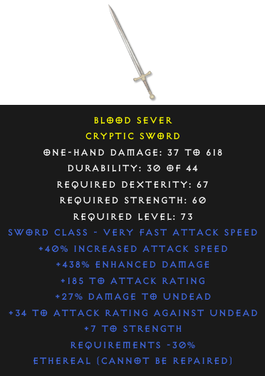 Cryptic Sword: Blood SeverRequired Level: 73 Rarity: rare | Select the realm to see the price |