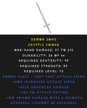 Required Level: 73+40% Increased Attack Speed+324 to Attack Rating+435% Enhanced Damage100 Poison Damage over time