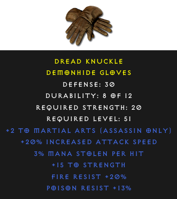 Demonhide Gloves: Dread KnuckleRequired Level: 51 Rarity: rare | Select the realm to see the price |