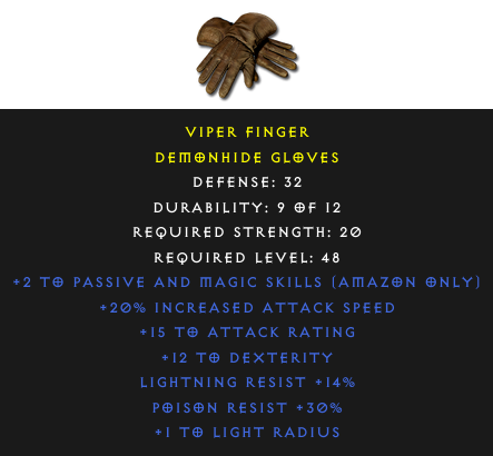 Demonhide Gloves: Viper FingerRequired Level: 48 Rarity: rare | Select the realm to see the price |