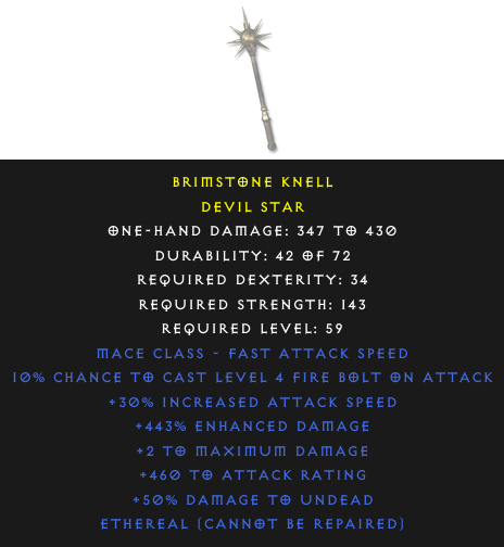 Required Level: 59+30% Increased Attack Speed+2 to Maximum Damage+460 to Attack Rating+443% Enhanced Damage+50% Damage to Undead