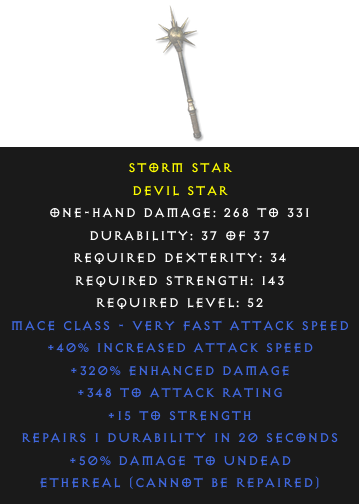 Required Level: 52+40% Increased Attack Speed+15 to Strength+348 to Attack Rating+320% Enhanced DamageRepairs Durability+50% Damage to Undead