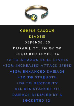 Required Level: 74+2 to Amazon Skill LevelsDefense: 55+30% Increased Attack Speed+30 to Strength+20 to DexterityAll Resistances +13Socketed (2)+80% Enhanced DamageDamage Reduced by 4
