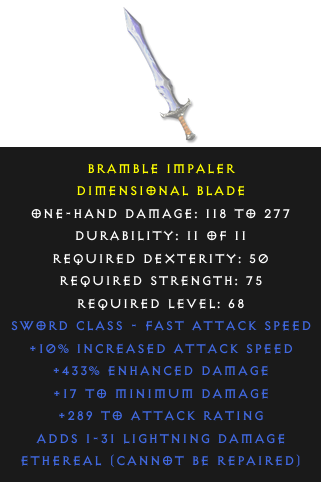 Required Level: 68+10% Increased Attack Speed+289 to Attack Rating+433% Enhanced DamageAdds Damage+17 to Minimum Damage