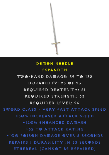 Required Level: 26+30% Increased Attack Speed+62 to Attack Rating+120% Enhanced DamageRepairs Durability100 Poison Damage over time