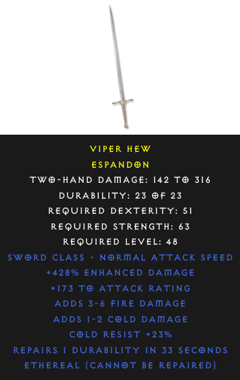 Required Level: 48+173 to Attack RatingCold Resist +23%+428% Enhanced DamageAdds Cold DamageAdds Fire DamageRepairs Durability