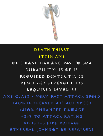 Required Level: 52+40% Increased Attack Speed+347 to Attack Rating+410% Enhanced DamageAdds Fire Damage