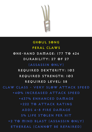 Required Level: 58+2 to Mind Blast (Assassin only)+40% Increased Attack Speed+222 to Attack Rating+437% Enhanced DamageAdds Fire Damage5% Life stolen per hit