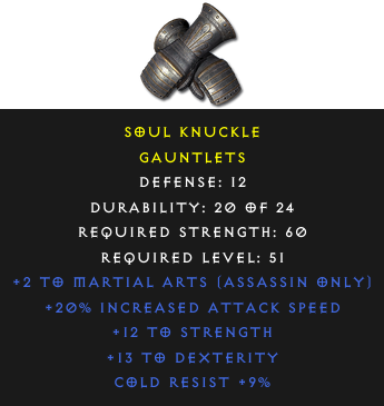 Required Level: 51Defense: 12+2 to Martial Arts (Assassin only)+20% Increased Attack Speed+12 to Strength+13 to DexterityCold Resist +9%