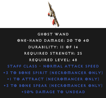 Required Level: 48+3 to Bone Spirit (Necromancer only)+1 to Attract (Necromancer only)+3 to Bone Spear (Necromancer only)+50% Damage to Undead