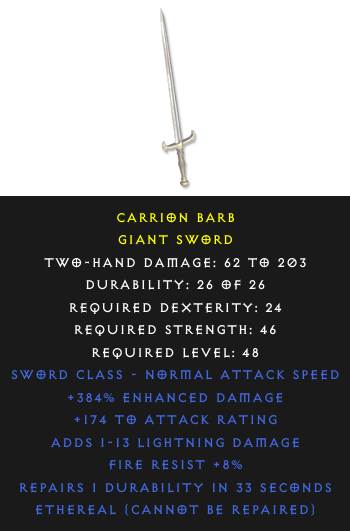 Required Level: 48+174 to Attack RatingFire Resist +8%+384% Enhanced DamageAdds DamageRepairs Durability