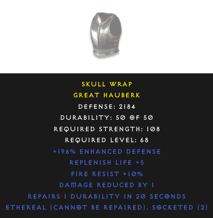 Required Level: 68Defense: 2184Replenish Life +5Socketed (2)Fire Resist +10%+196% Enhanced DefenseRepairs DurabilityDamage Reduced by 1