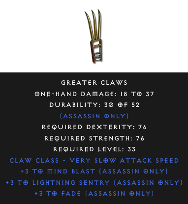 Required Level: 33+3 to Mind Blast (Assassin only)+3 to Lightning Sentry (Assassin only)+3 to Fade (Assassin only)