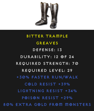 Required Level: 29Defense: 13+30% Faster Run/WalkPoison Resist +29%Cold Resist +39%Lightning Resist +34%80% Extra Gold from Monsters