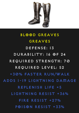 Required Level: 52Defense: 13+30% Faster Run/WalkReplenish Life +5Poison Resist +33%Lightning Resist +36%Fire Resist +27%Adds Damage
