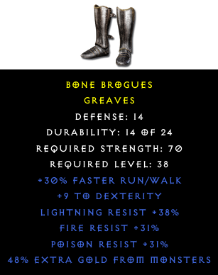 Required Level: 38Defense: 14+30% Faster Run/Walk+9 to DexterityPoison Resist +31%Lightning Resist +38%Fire Resist +31%48% Extra Gold from Monsters