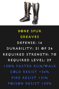 Required Level: 29Defense: 14+30% Faster Run/WalkPoison Resist +35%Cold Resist +34%Fire Resist +31%
