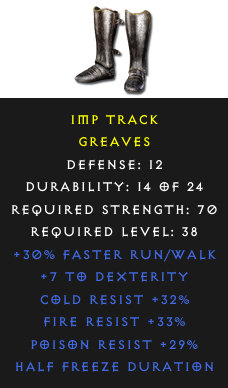 Required Level: 38Defense: 12+30% Faster Run/Walk+7 to DexterityPoison Resist +29%Cold Resist +32%Fire Resist +33%Half Freeze Duration