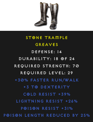Required Level: 29Defense: 14+30% Faster Run/Walk+3 to DexterityPoison Resist +31%Cold Resist +39%Lightning Resist +26%Poison Length Reduced by 25%