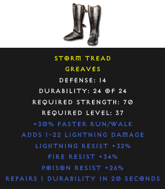Required Level: 37Defense: 14+30% Faster Run/WalkPoison Resist +26%Lightning Resist +32%Fire Resist +34%Adds DamageRepairs Durability