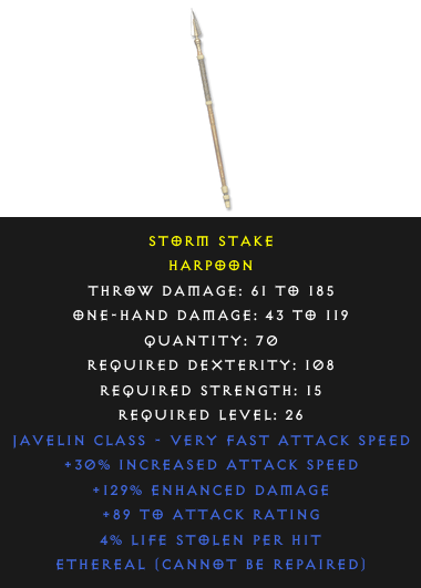 Required Level: 26+30% Increased Attack Speed+89 to Attack Rating+129% Enhanced Damage4% Life stolen per hit
