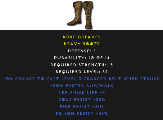 Required Level: 52Defense: 5+30% Faster Run/WalkReplenish Life +3Poison Resist +36%Cold Resist +23%Fire Resist +31%