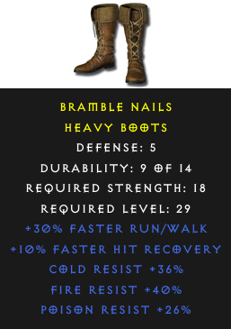 Required Level: 29Defense: 5+10% Faster Hit Recovery+30% Faster Run/WalkPoison Resist +26%Cold Resist +36%Fire Resist +40%