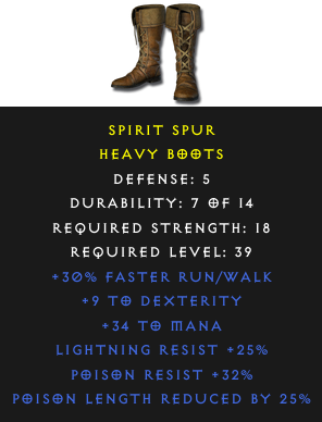 Required Level: 39Defense: 5+30% Faster Run/Walk+9 to DexterityPoison Resist +32%Lightning Resist +25%Poison Length Reduced by 25%+34 to Mana