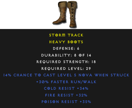 Required Level: 29Defense: 6+30% Faster Run/WalkPoison Resist +35%Cold Resist +34%Fire Resist +32%