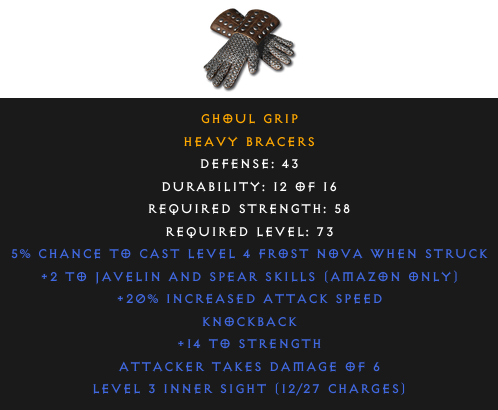 Required Level: 73Defense: 43+2 to Javelin and Spear Skills (Amazon only)+20% Increased Attack Speed+14 to StrengthKnockbackAttacker Takes Damage of 6