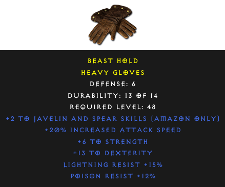 Required Level: 48Defense: 6+2 to Javelin and Spear Skills (Amazon only)+20% Increased Attack Speed+6 to Strength+13 to DexterityPoison Resist +12%Lightning Resist +15%