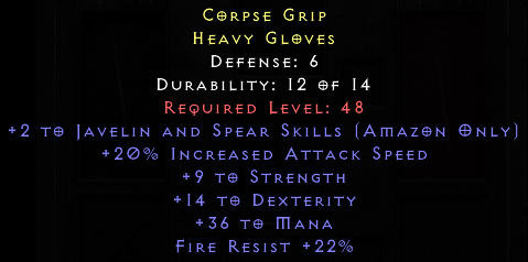 Defense: 6Required Level: 48+2 to Javelin and Spear Skills (Amazon only)+9 to Strength+14 to Dexterity+36 to Mana+20% Increased Attack SpeedFire Resist +22%