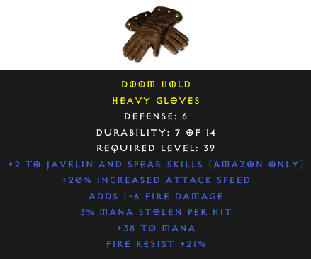 Required Level: 39Defense: 6+2 to Javelin and Spear Skills (Amazon only)+20% Increased Attack SpeedFire Resist +21%Adds Fire Damage3% Mana stolen per hit+38 to Mana