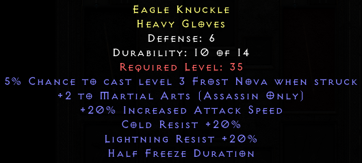 Defense: 6Required Level: 35+2 to Martial Arts (Assassin only)+20% Increased Attack SpeedCold Resist +20%Lightning Resist +20%