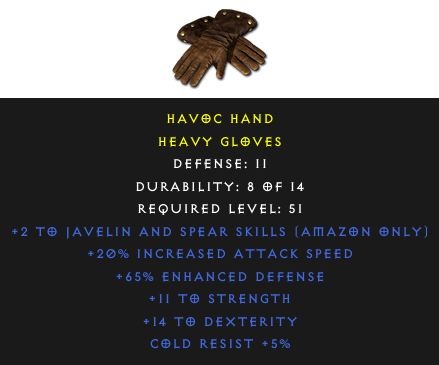Required Level: 51Defense: 11+2 to Javelin and Spear Skills (Amazon only)+20% Increased Attack Speed+11 to Strength+14 to DexterityCold Resist +5%+65% Enhanced Defense