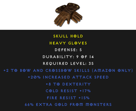 Required Level: 35Defense: 5+2 to Bow and Crossbow Skills (Amazon only)+20% Increased Attack Speed+8 to DexterityCold Resist +17%Fire Resist +15%66% Extra Gold from Monsters