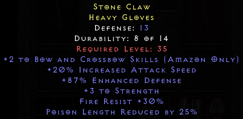 Defense: 13Required Level: 35+2 to Bow and Crossbow Skills (Amazon only)+3 to StrengthPoison Length Reduced by 25%+20% Increased Attack SpeedFire Resist +30%+87% Enhanced Defense
