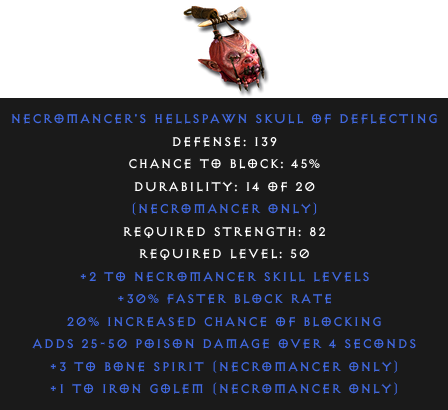 Hellspawn Skull: Necromancers Hellspawn Skull Of DeflectingRequired Level: 50 Rarity: magic | Select the realm to see the price |