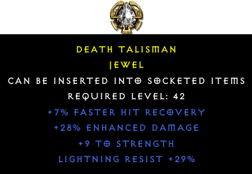 Required Level: 42+7% Faster Hit Recovery+9 to StrengthLightning Resist +29%+28% Enhanced Damage