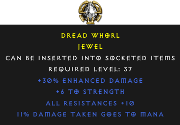 Required Level: 37+6 to StrengthAll Resistances +10+30% Enhanced Damage11% Damage Taken Goes To Mana