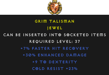 Required Level: 37+7% Faster Hit Recovery+9 to DexterityCold Resist +23%+30% Enhanced Damage