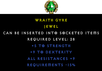 Required Level: 28+5 to Strength+9 to DexterityAll Resistances +9Requirements -15%