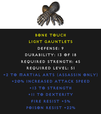 Required Level: 51Defense: 9+2 to Martial Arts (Assassin only)+20% Increased Attack Speed+13 to Strength+11 to DexterityPoison Resist +22%Fire Resist +5%